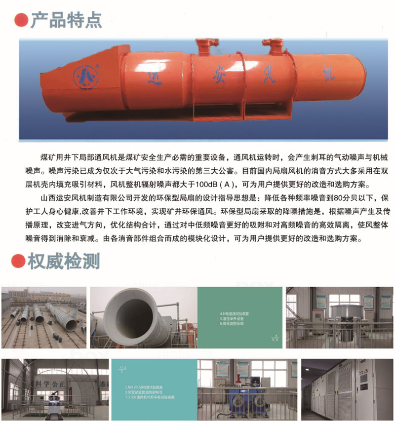 运安风机多年以来一直注重技术的投入和产品的更新换代,先后与西安交大、中科院、山西矿院等科技院校合作,并长期聘用十多位通风机专家和教授担任企业的技术顾问,对产品进行设计和研发,以保证产品的安全可靠和先进性,如:叶型设计我们将先进的航空动力学三元流动理论,在弯掠组合正交型三维扭曲叶型进一步改进,通过计算机流场计算分析,和模型机的实验到测试,推出新型的扭曲型叶片应用于局部通风机;使通风机性能更加优越,节能效果更加明显、同时降低了噪音。