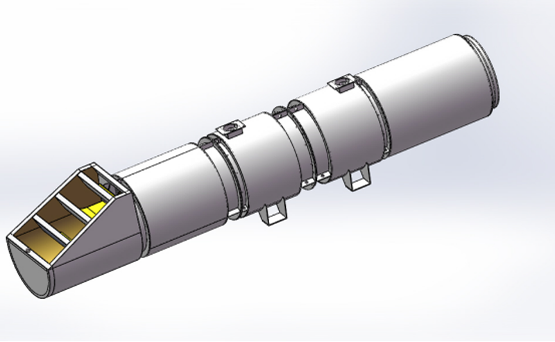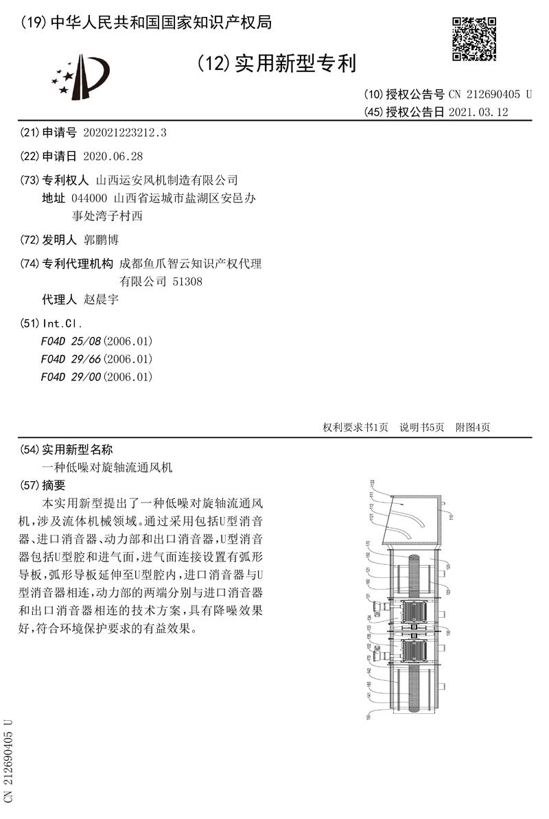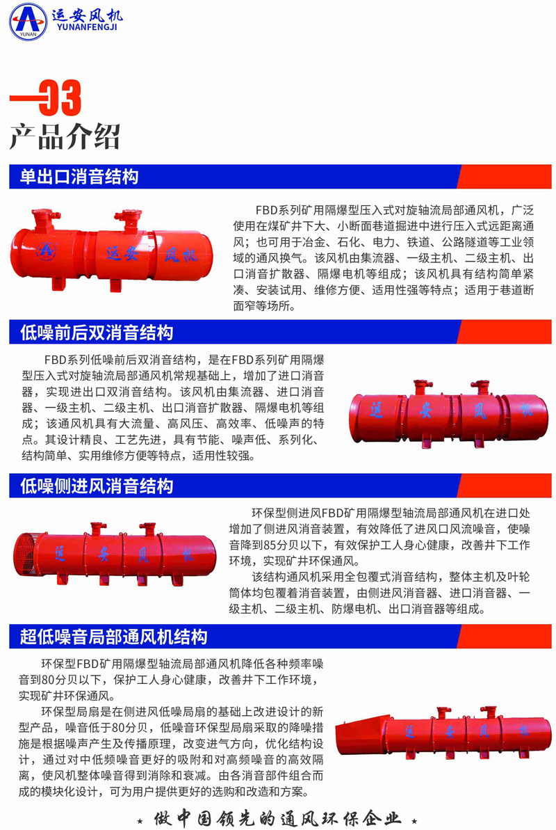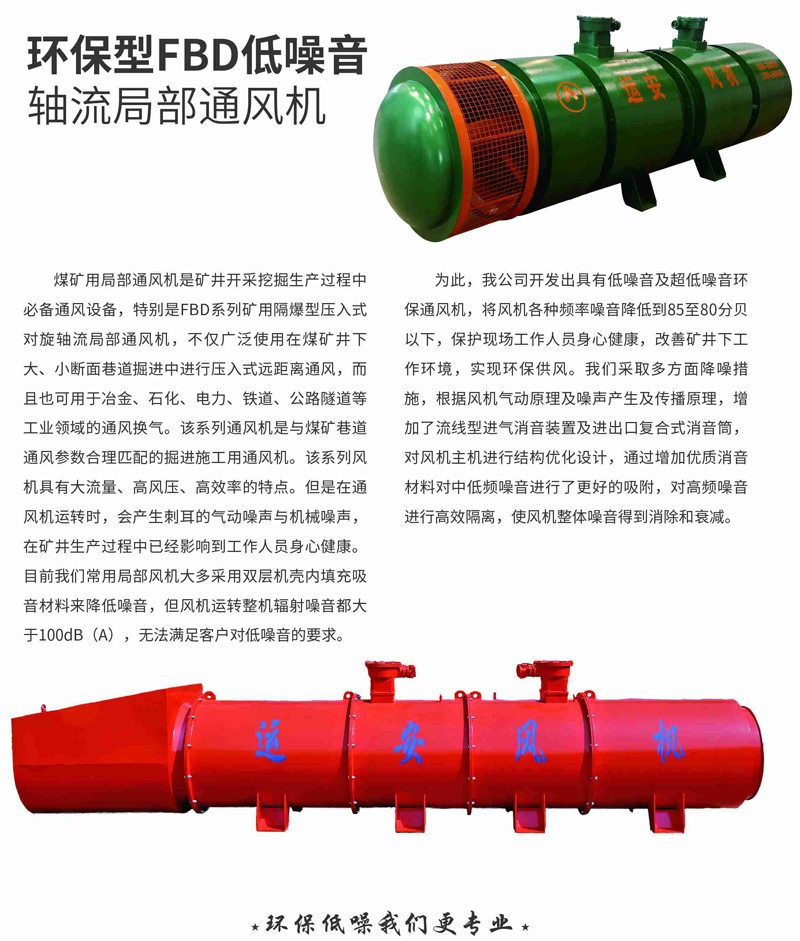 煤矿用局部通风机是矿井开采挖掘生产过程中必备通风设备,特别是FBD系列矿用隔爆型压入式对旋轴流局部通风机,不仅广泛使用在煤矿井下大、小断面巷道掘进中进行压入式远距离通风,而且也可用于冶金、石化、电力、铁道、公路隧道等工业领域的通风换气。该系列通风机是与煤矿巷道通风参数合理匹配的掘进施工用通风机。该系列风机具有大流量、高风压、高效率的特点。但是在通风机运转时,会产生刺耳的气动噪声与机械噪声,在矿井生产过程中已经影响到工作人员身心健康。目前我们常用局部风机大多采用双层机壳内填充吸音材料来降低噪音,但风机运转整机辐射噪音都大于110dB(A),无法满足用户对低噪的要求。