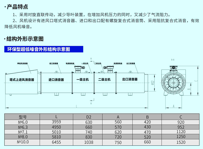 1、通风机叶型采用圆弧板叶型,极大的改善了风机的性能参数,最大限度地发挥了该系列风机高效、节能、环保的优势。